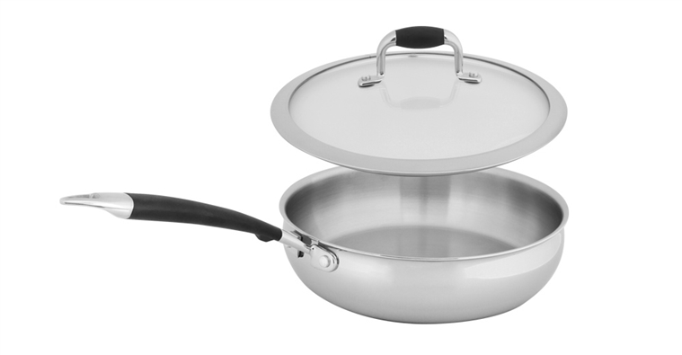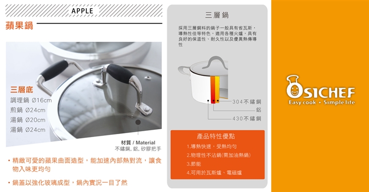 ★以外層403不鏽鋼加上中間的鋁質夾層、鍋身內層採用頂級304不鏽鋼,三層加工完成的三層鍋身,不僅讓鍋身的熱傳導更加均勻,也能透過溫度的提升膨脹材料的表面密度,達到物理不沾鍋的功能。
