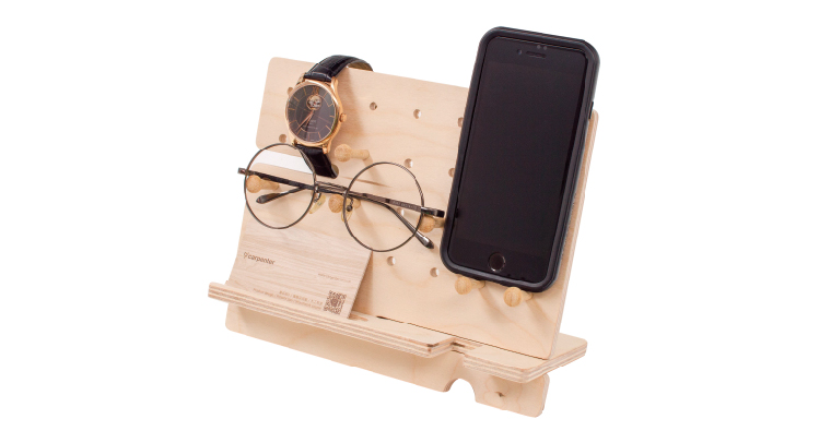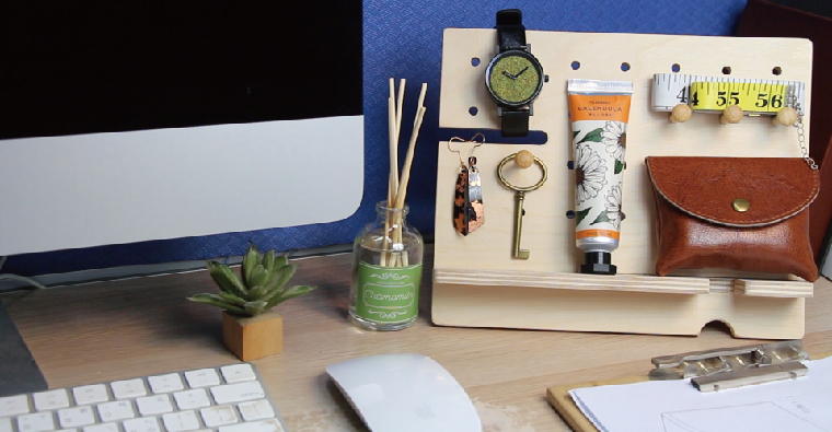洞洞板附有十個木釘,根據喜好在不同位置扣進木釘,掛上個人飾品,如:項鍊、耳環、鑰匙圈、眼鏡。