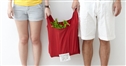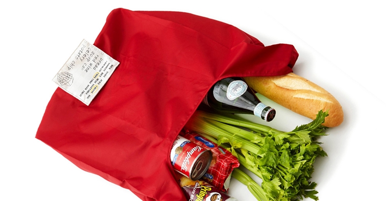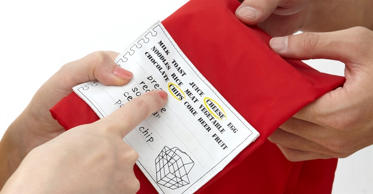 SHOPPING LIST購物清單環保包,收納袋上的特殊印刷讓你可以直接以鉛筆在上面重覆書寫,展開後則是加大尺寸的正紅色包包,上面印有簡單可愛的小圖示,讓你可以輕鬆地在使用完後將包包收回收納袋中。